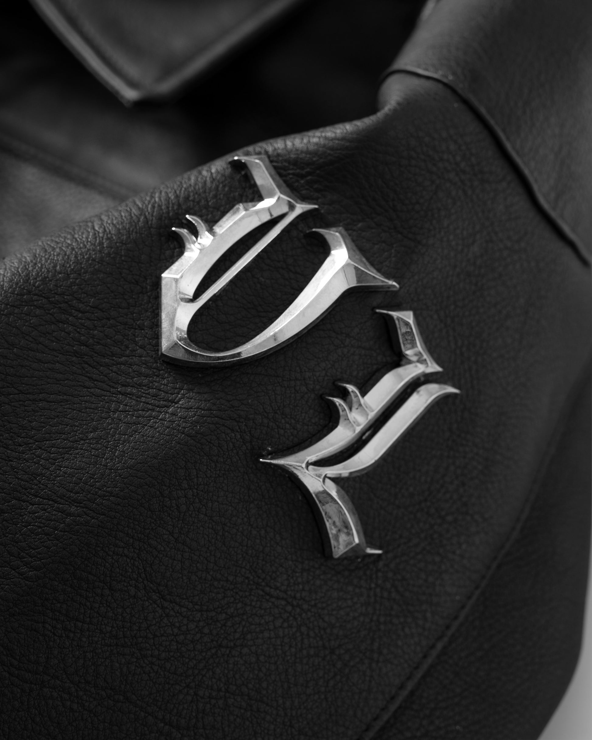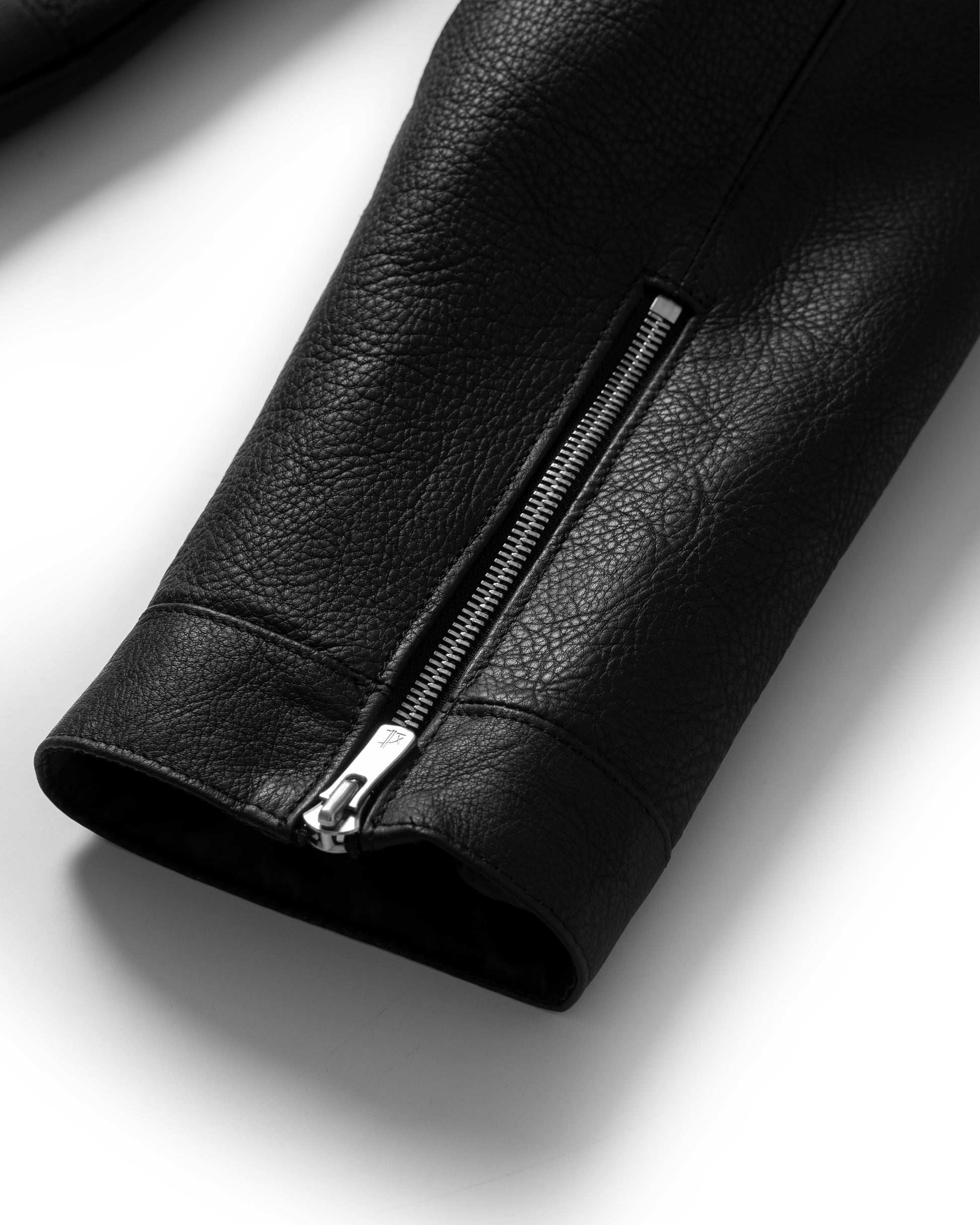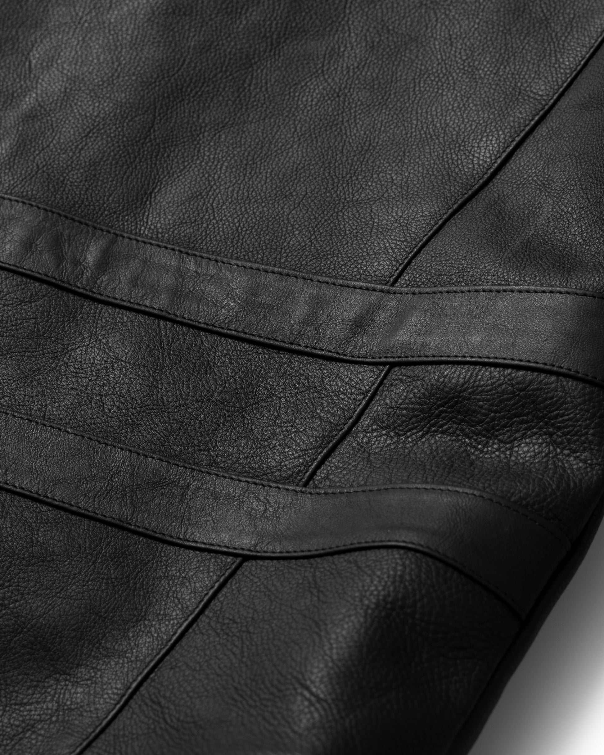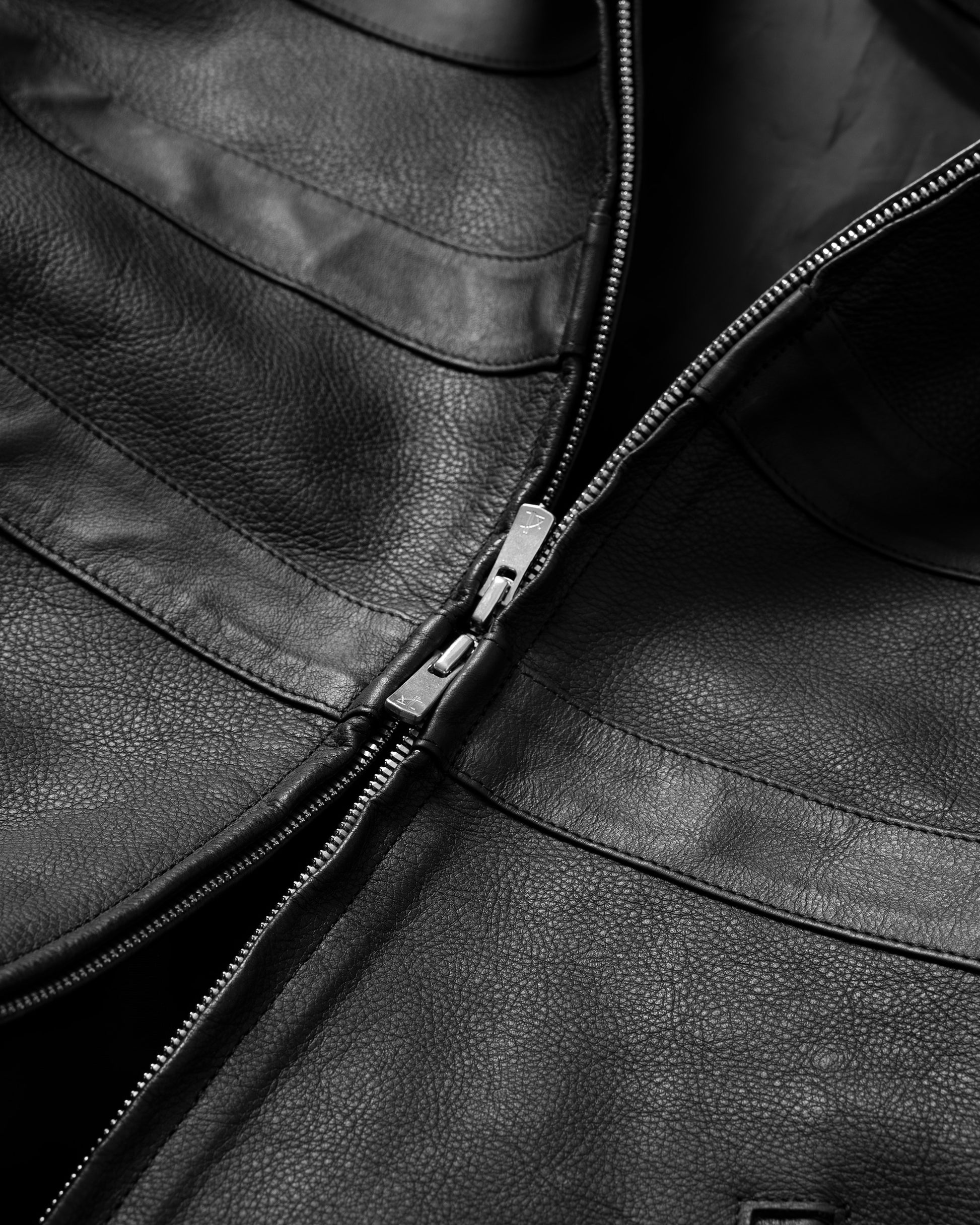 Shoulder pads are tailored, Using Excella zippers, Metal logo is attached on the sleeve, Embroidered with leather patch on the back