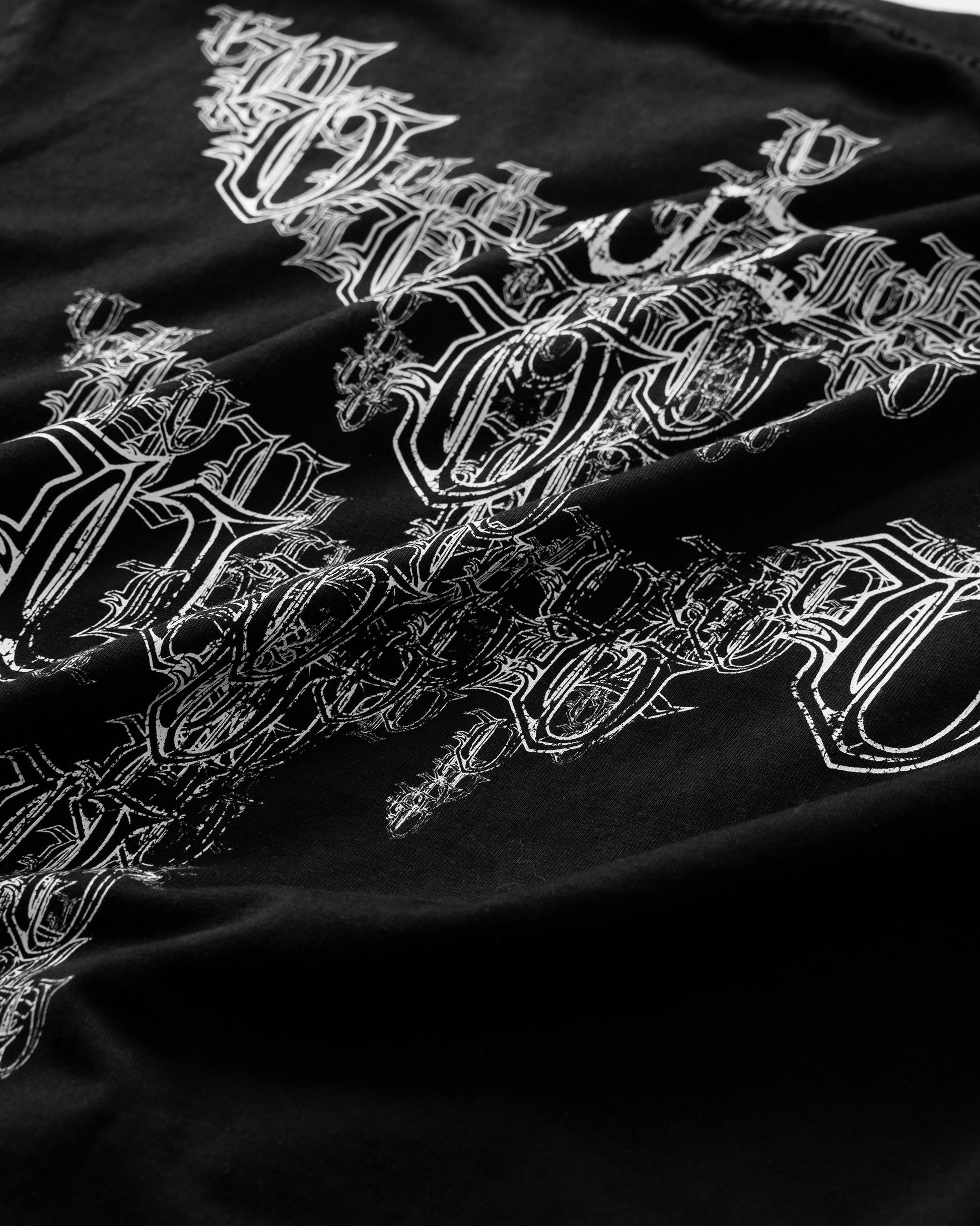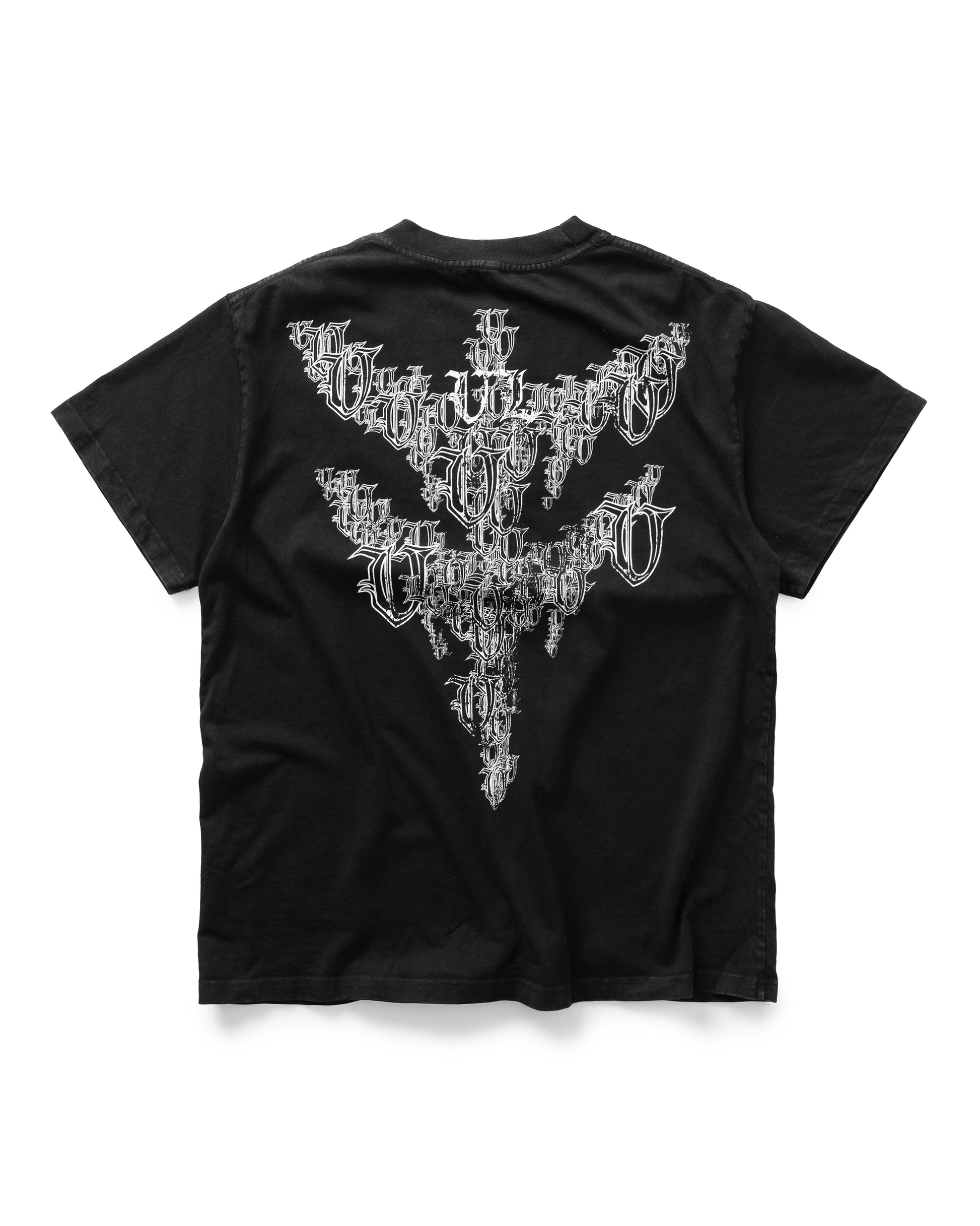 Details: Light silver wash T-shirt, back printed with multi logo pattern in the shape of a cross